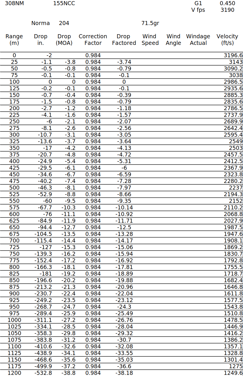 As a comparative exercise, use two or three different softare programs to produce the same drop chart, and notice how they differ from each other. JBM Ballistics seems to have more accurate math equations behind it.